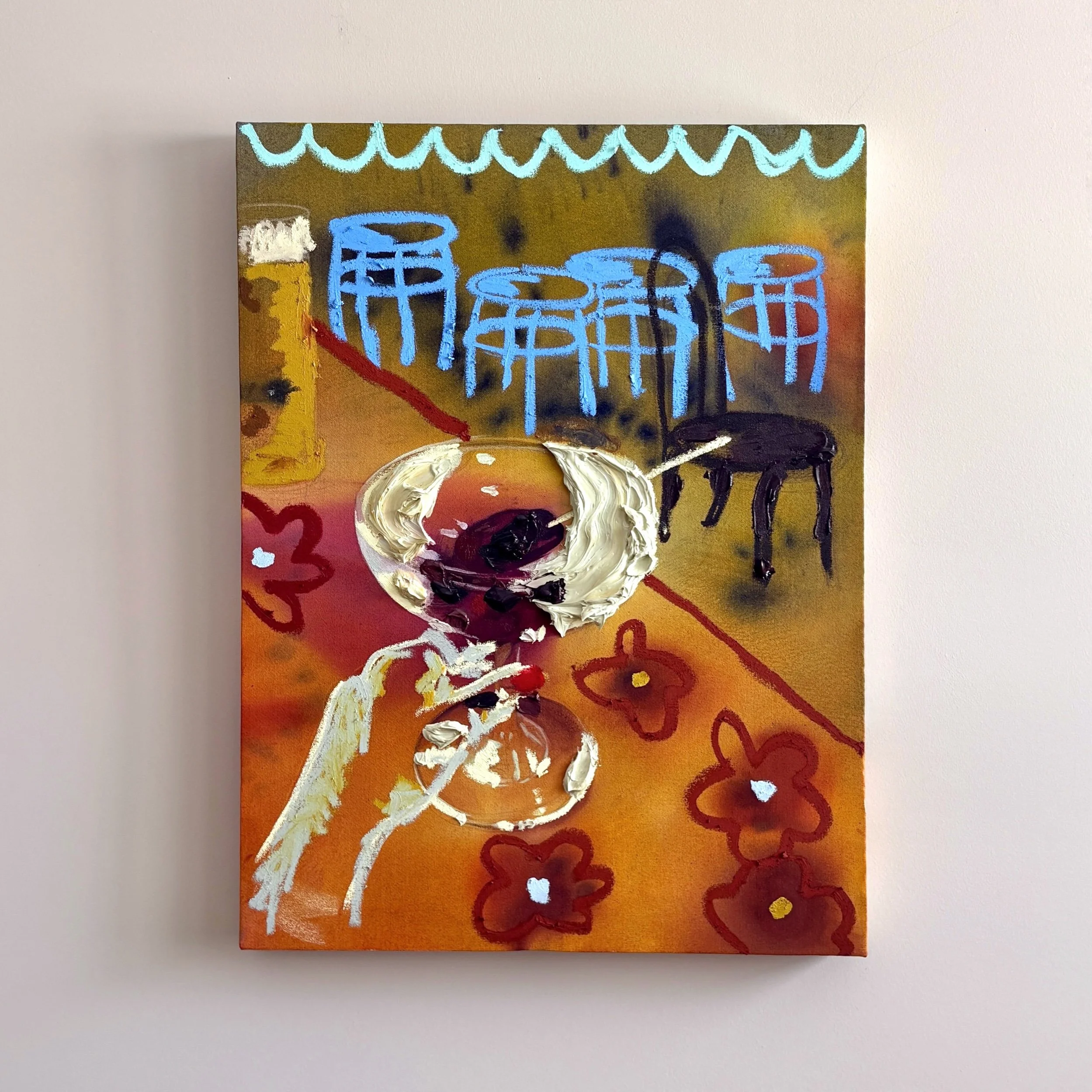 A row of blue chairs stands empty along a mustard-yellow wall, their outlines sharp yet slightly askew, as if waiting for guests who never arrive. In the foreground, a tall wine glass tilts precariously, filled with dark berries that gleam like hidden jewels against the creamy stem, while a black chair lurks in shadow nearby. Small red flowers dot the ochre floor like spilled secrets, and white wisps trail from the glass’s edge, suggesting motion or memory caught mid-spill. This scene hums with anticipation’s quiet ache—an abandoned gathering where absence speaks loudest.