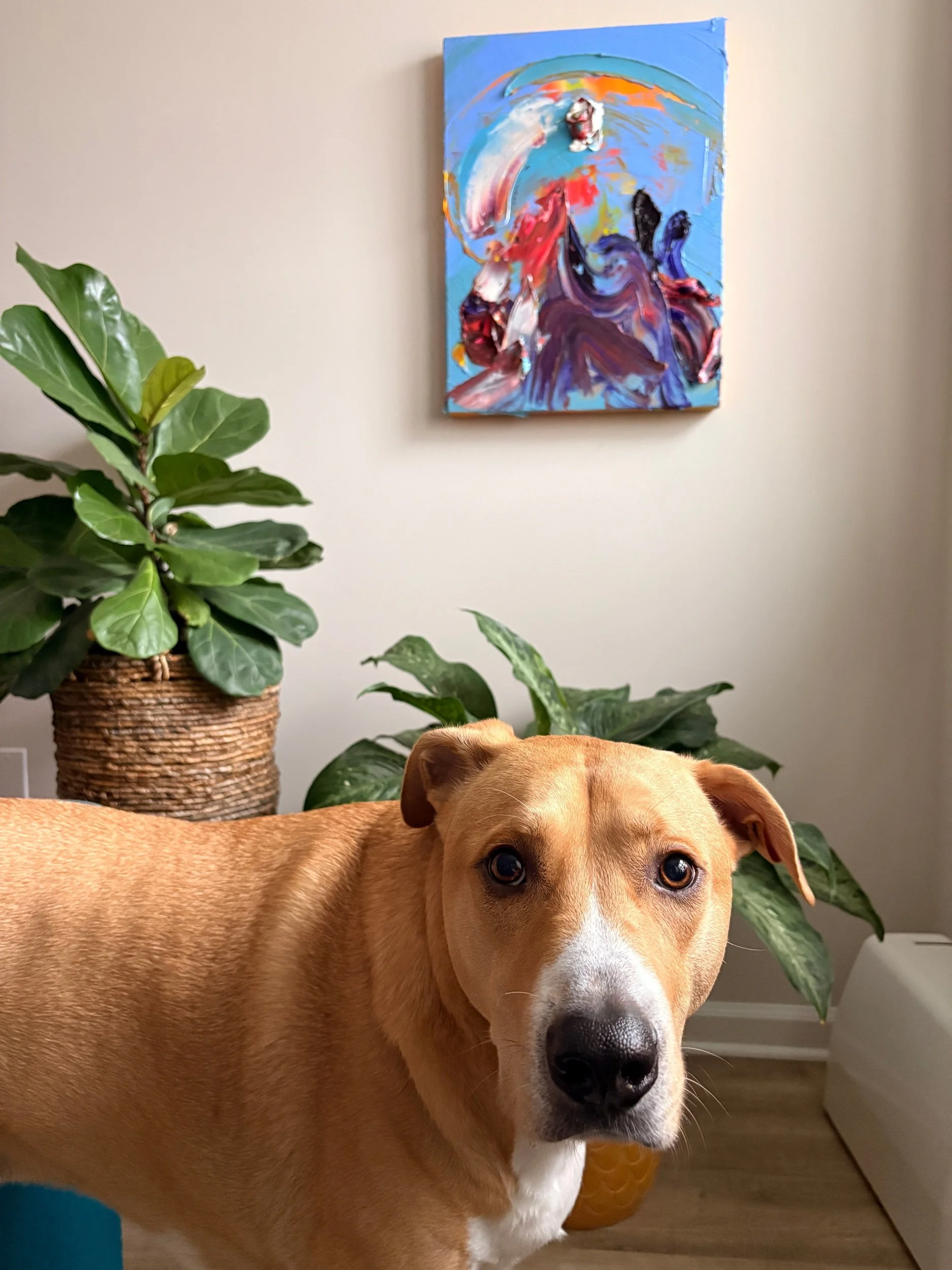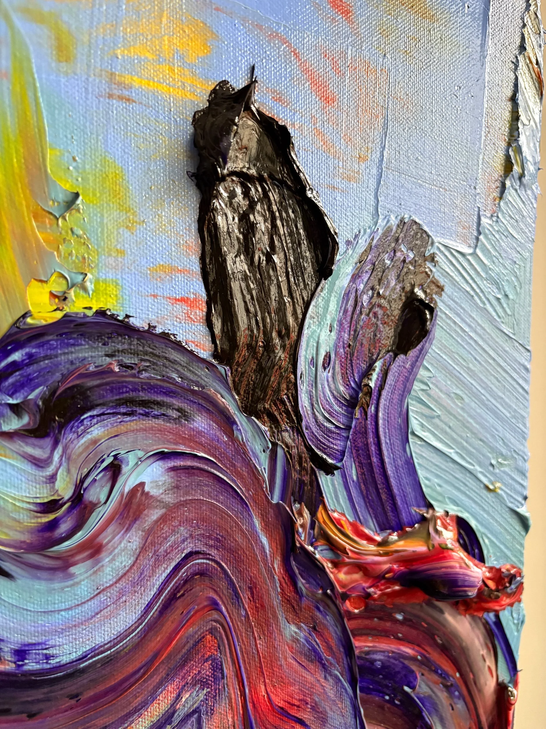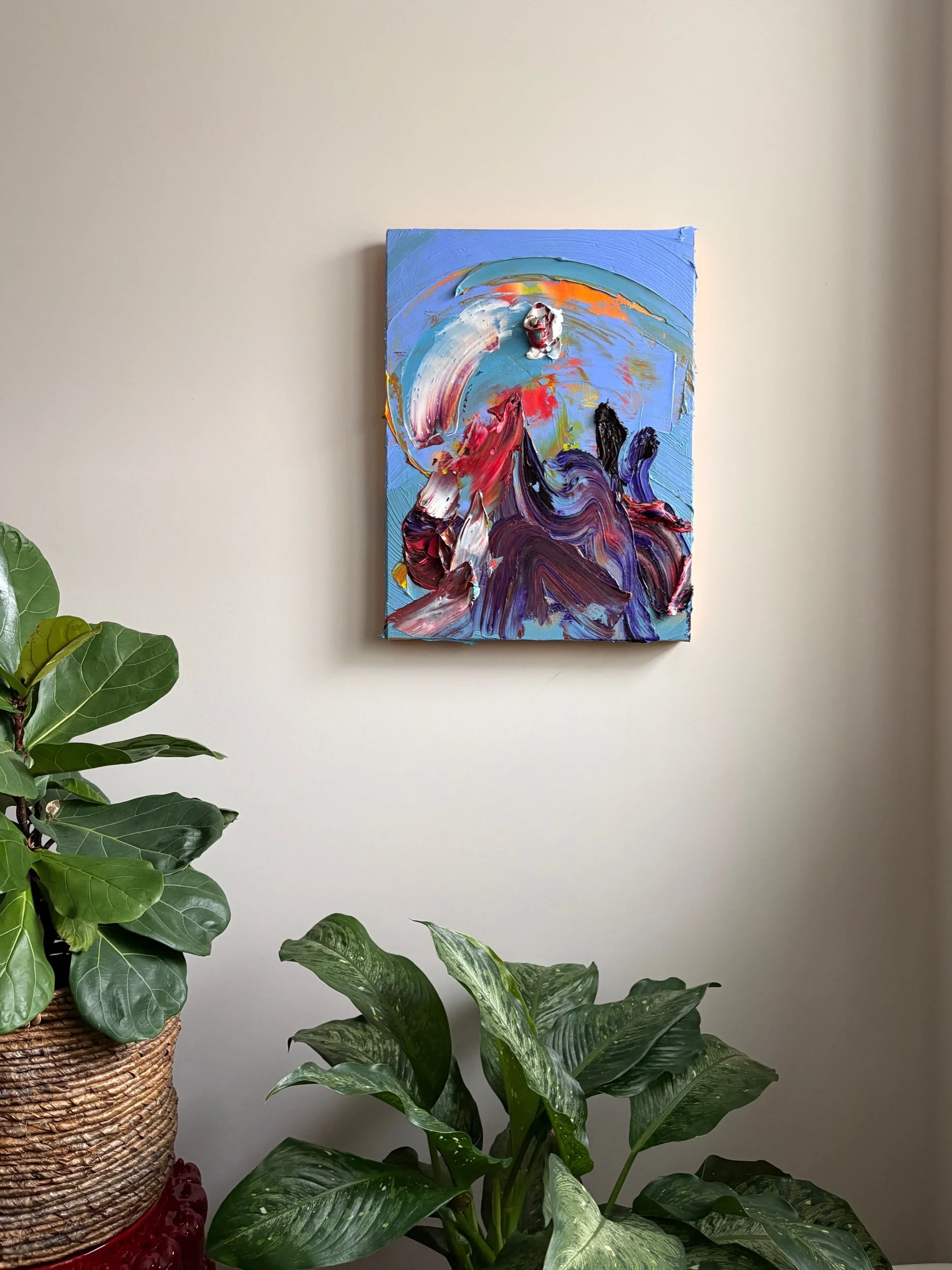 I had no idea where it was going, I just kept piling paint until it felt right. The bottom part looks like my emotions got tired of being polite and decided to explode in all directions, eventually turning into mountains, very dramatic, soap-opera mountains. The thick strokes feel like they’re arguing with each other but still somehow making it work. The big swoosh on the left was me trying to ‘calm the chaos,’ but it ended up looking like an accidental rainbow, the kind you get when the weather can’t decide what it’s doing. And the chunky blob at the top became a sun, like it just planted itself there and now stares at me in a judgmental yet supportive way. Somehow the whole thing ended up looking like nature having an emotional breakdown. And honestly? That feels very accurate to my creative process.
